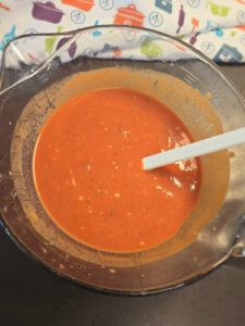 In der Zwischenzeit passierte Tomaten, stückige Tomaten, Creme fraiche, Ajvar, Gemüsebrühe, Salz, Zucker und Paprika in der großen Nixe miteinander verrühren