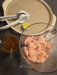 Hähnchen in mundgerechte Stücke schneiden und in die große Nixe geben