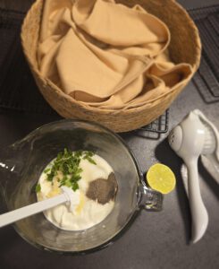 In dieser Zeit die Joghurtsoße anrühren: Hierfür Joghurt, gehackte Minze, gepresste Knoblauchzehen, Limettensaft, Salz und Pfeffer in die Nixe geben