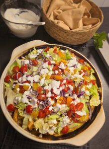 Salat, Zwiebel, Tomaten und die Joghurtsoße darüber verteilen