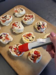 Blätterteig von der langen Seite her aufrollen und in etwa 10-12 Stücke schneiden