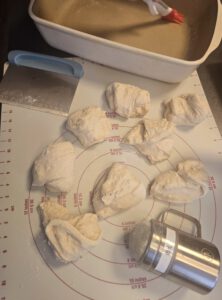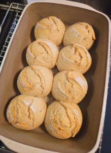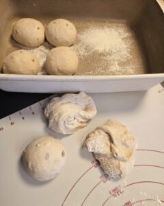 Jeden Teigling mehrmals falten und rund schleifen.Teiglinge in die Ofenhexe setzen Danach bemehlen und einschneiden