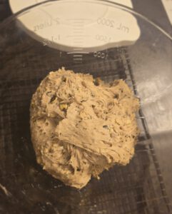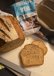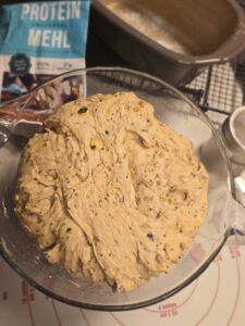 Mehl, Salz, Sonnenblumenkerne, Kürbiskerne, Öl und die gequollenen Chiasamen dazu geben4 Min. / Knetstufe 350 gr. Proteinmehl, z.B. Mühlenkraft, 10 gr. Salz, 1 EL Olivenöl, 40 gr. Sonnenblumenkerne, 30 gr. Kürbiskerne, 150 gr. Joghurt 1,5 %