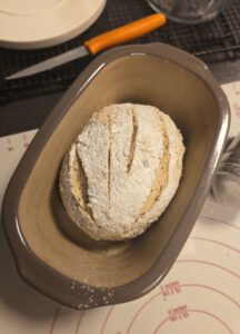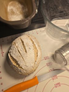 Unter Zugabe von etwas Mehl den Teig mehrmals falten und zu einem Brotlaib formen. Danach bemehlen und einschneiden (hierfür habe ich normales Dinkelmehl aus meinem Streufix benutzt)