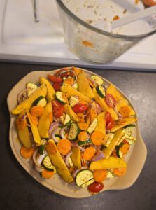 1 Karotte, 5 Cocktailtomaten, 1 kleine rote Zwiebel, 1 kleine Zucchini, 1 Schuss Olivenöl + Gemüsegewürz / Salz