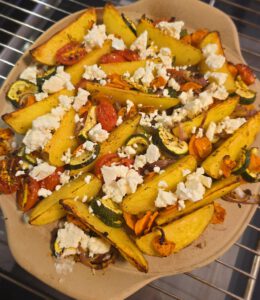 Nach der Backzeit Feta zerkrümeln und über den Kartoffeln und dem Gemüse verteilen