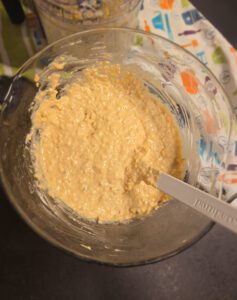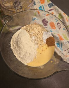 Teig in die Nixe umfüllen. Mehl, Haferflocken, Backpulver, Zimt und Salz dazu geben