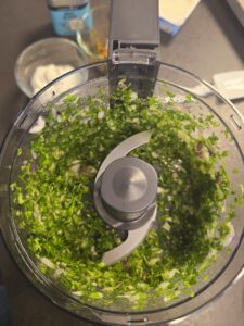 Petersilie, Schnittlauch und halbierte Zwiebel in den Elektrischen Multi-Zerkleinerer "Up & Down" geben