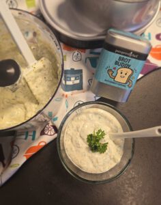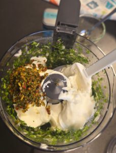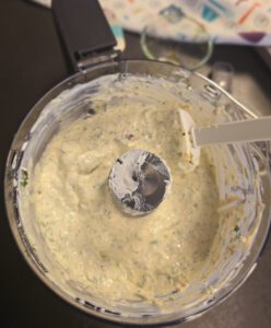 Brot Buddy mit 3 TL Wasser verrühren und etwa 3-5 Minuten stehen lassen, dann in den Elektrischer Multi-Zerkleinerer "Up & Down" geben. Frischkäse, Joghurt und Salz ebenfalls dazu geben 200 gr. Frischkäse leicht, z.B. Buko balance, 100 gr. griechischer Joghurt 2 %, 2 TL Brot Buddy verrührt mit 3 TL Wasser, 1/2 TL Salz