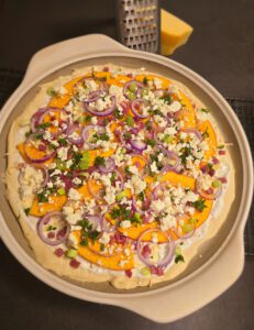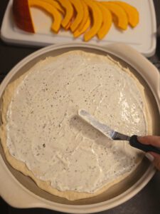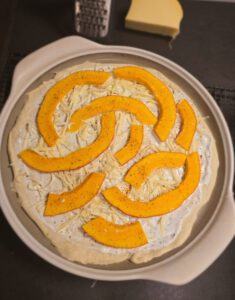 Kürbis darauf legen und mit Kürbisgewürz (Alternativ Salz & Pfeffer) würzen