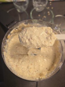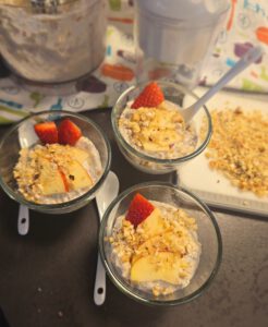 100 gr. kernige Haferflocken, 200 gr. griechischer Joghurt, 100 gr. Skyr, 1 TL Honig