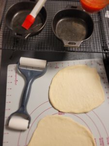 In der Zwischenzeit Pizzateig auf der Teigunterlage mit dem Teigroller rund ausrollen