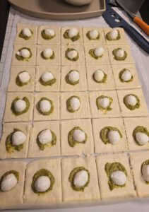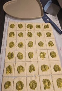 Pizzateig auf der Teigunterlage aufrollen und mit dem Teigschneider oder Nylonmesser in quadratische Stücke teilen. Etwa 6x6 cm