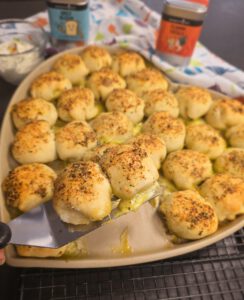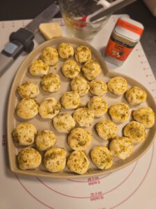 Herzstück in den Backofen stellen, auf einen Gitterrost unterste Schiene.Backzeit 15-18 Minuten Für den Dip: Frischkäse, Brot Buddy und einen Schuss Wasser in einer Elfe vermengen
