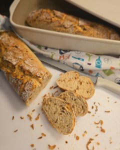 Beide Mehlsorten, Öl, Salz, Kräuter und Röstzwiebeln dazu geben3 Min. / Knetstufe 350 gr. Dinkelmehl 630er, 170 gr. Dinkelmehl 1050er, 12 gr. Salz, 1 TL ital. Kräuter (getrocknet), 1 EL Olivenöl, 50 gr. Röstzwiebel