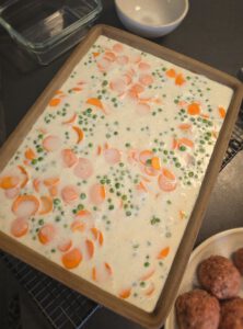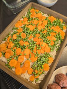 Erbsen und Karotten darüber verteilen
