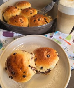 Backofen auf 180 Grad Ober- und Unterhitze vorheizen.Runde Ofenhexe dünn einfetten Teigunterlage bemehlen und Teig darauf geben. Diesen zu einem Rechteck ziehen und die Schokotröpfchen darauf geben