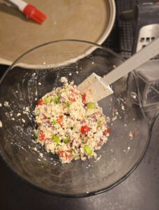 250 gr. Körniger Frischkäse 2,5%, 1 Ei, 75 gr. mageren Speck, 1 EL ital. Kräuter TK, 1/2 TL Salz, 2 Prisen Pfeffer, 1/2 Kugel Mozzarella leicht