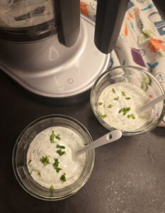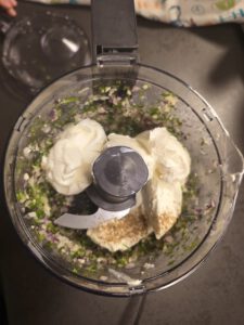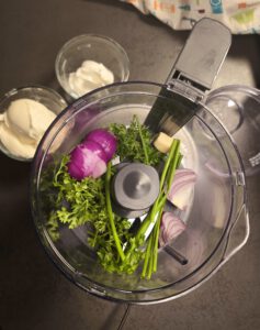 In dieser Zeit den Dip zubereiten: Petersilie, Schnittlauf, Knoblauchzehe und die geviertelte Zwiebel in den Elektrischen Multi-Zerkleinerer "Up & Down" geben. etwa 15 gr. Petersilie und Schnittlauch gemischt, 1 Knoblauchzehe, 1 kleine rote Zwiebel