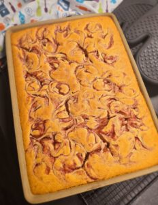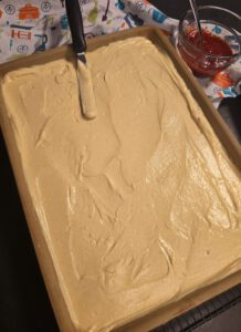 Marmelade kurz durchrühren und Kleckse auf dem Teig verteilen