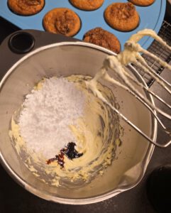 Dann Puderzucker und Vanilleextrakt dazu geben und nochmals verrühren