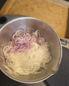 Zwiebeln schälen und mit dem kleinen Küchenhobel Stufe 1 in dünne Ringe hobeln