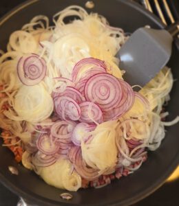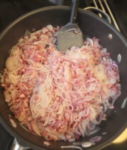 Speck in die Pfanne geben und anbraten, dann Zwiebeln dazu geben