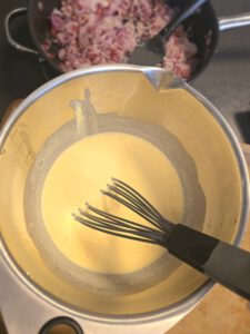 Milch, Hefe und Zucker in den Mixtopf vom Thermomix geben2 Min. / 37 Grad / Stufe 2 150 gr. Milch, 10 gr. frische Hefe, 1 TL brauner Zucker