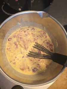 Zwiebeln zu der Eimischung geben und alle gut vermengen