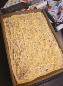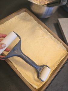 Großen Ofenzauberer einfetten, Teig darauf geben und mit dem Teigroller ausrollen. Dabei mit der schmalen Seite des Teigrollers die Ränder etwas hochziehen